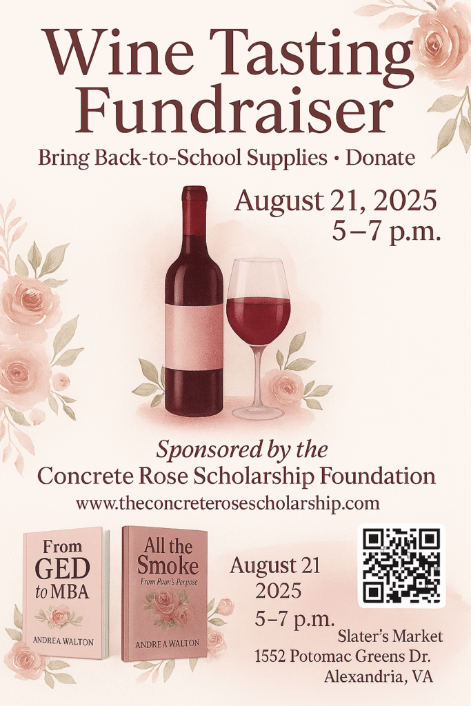 August 2025, Alexandria, VA — The Concrete Rose Scholarship Foundation is inviting the community to join in for an evening of giving and connection at its Back-to-School Fundraiser and School Supply Drive, taking place on Thursday, August 21, 2025, at 5:00 p.m. at Slater’s Market: 1552 POTOMAC GREENS DRIVEALEXANDRIA, VA, 22314 • slatersmarket.com.