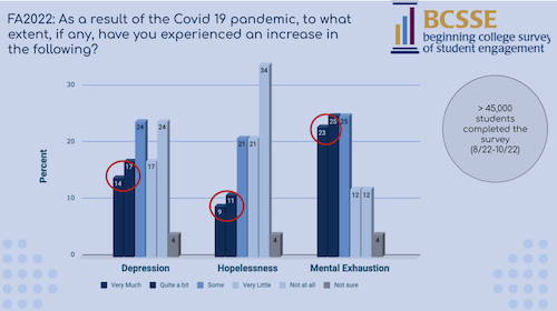 In the Beginning College Survey of Student Engagement conducted in the Fall semester of 2022, you can see the level of distress among entering college students from residual pandemic impacts. Shockingly, almost 50% of students surveyed reported mental/emotional exhaustion as they began their collegiate educational journey. Will they have the resilience to manage normal, expected college stressors if they are exhausted? The increase in student well-being places pressure on both fiscal and human resources as student-facing staff and faculty are left to grapple with the complexities of complicated sustainable solutions.