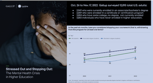 Gallup and Lumina surveyed cross-comparison of enrolled, not currently enrolled, and never enrolled adults across the US. With 41% of students polled having considered stopping coursework in the past six months, the need to support retaining students may be more urgent than ever.