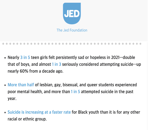 The Jed Foundation is a nonprofit organization that protects emotional health and prevents suicide for teens and young adults nationwide. The graphic, right, summarizes the latest CDC data from the Youth Risk Behavior Survey, and the data are alarming.
