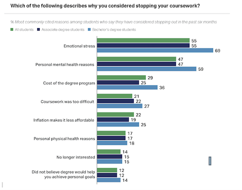 Additional data from this survey show 69% of students noting emotional stress as a cause for stopping out. These current data, combined with the broadly anticipated decline in the number of students attending college over the next decade, are a call to action, as it is imperative that institutions seek solutions to retain students.